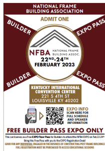 Register now for a FREE Contractor/Builder Pass to the 56th Annual NFBA Frame Building Expo in Louisville, KY. Click the Link Below to download your FREE EXPO FLOOR PASS to attend the 2023 NFBA EXPO on Feb 22nd-24th. Bring this pass with you Expo Registration Desk!