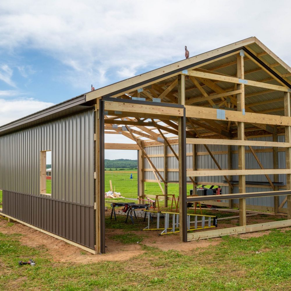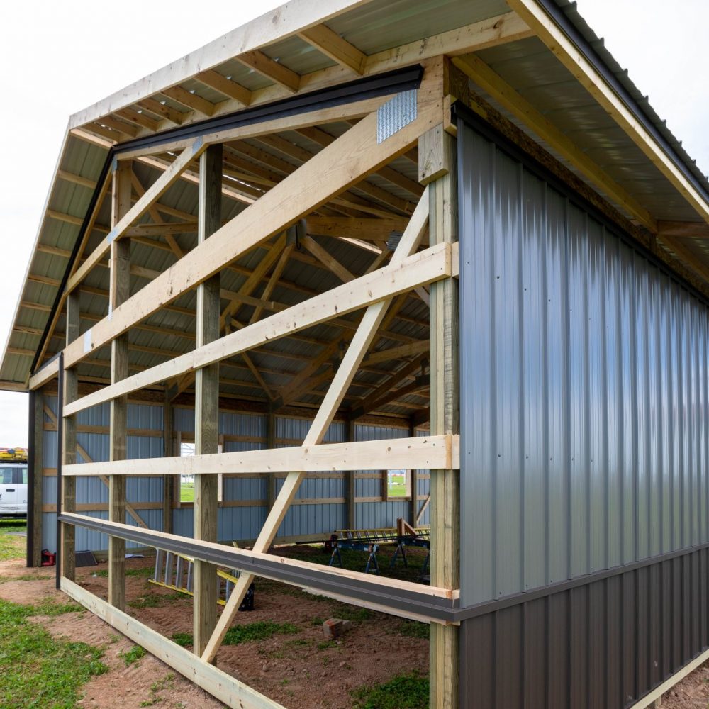 Cleary’s 30’ x 40’ building featured energy-efficient windows, the Cleary Craftsman Awning, and High Clearance Trusses. The walls and roofs of the building were pre-fabricated using Fabral’s metal panels, including GrandRib 3 Plus panels in Sierra and Burnished Slate for the roof and wall panels, and Crinkle Coat Burnished Slate for the trims.