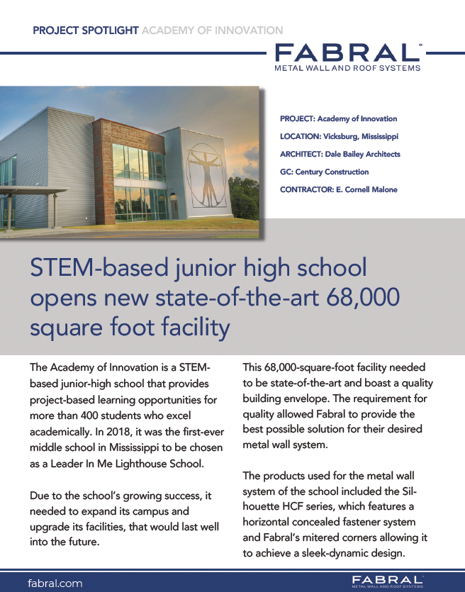The Academy of Innovation is a STEM-based junior-high school that provides project-based learning opportunities for more than 400 students who excel academically. In 2018, it was the first-ever middle school in Mississippi to be chosen as a Leader In Me Lighthouse School. Due to the school’s growing success, it needed to expand its campus and upgrade its facilities, that would last well into the future.