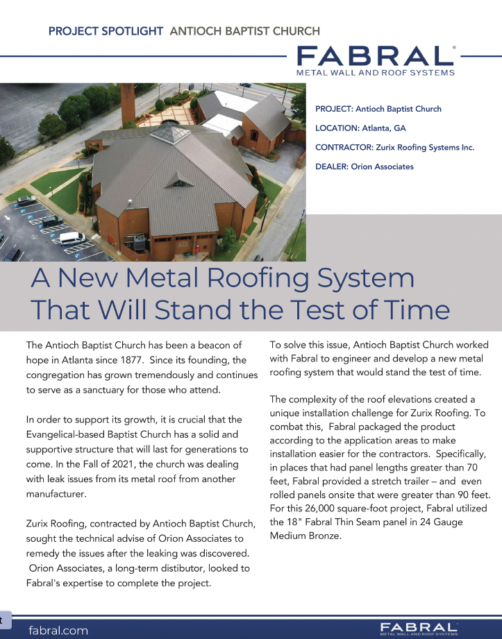 Zurix Roofing, contracted by Antioch Baptist Church, sought the technical advise of Orion Associates to remedy the issues after the leaking was discovered. Orion Associates, a long-term distributor, looked to Fabral’s expertise to complete the project.