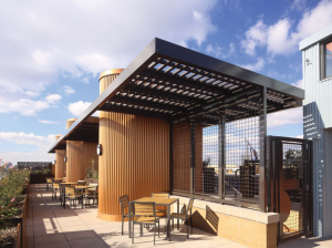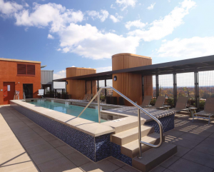 High-end living with a low-impact, sustainable lifestyle is important to residents of this 187 unit, LEED-certified building. Located less than a ten minute walk from two Metro subway stations, the surrounding mixed-use area allows residents to enjoy the best of city living. Balancing richness, affordability and flexibility, Fabral panels were chosen as a value engineering alternative to heavy gauge aluminum and copper specified for the project. Applied to in different colors to different surfaces, the panels create a harmonious whole without sacrificing style. Sheets, framing and trim were curved onsite to fit five rounded wall elements, including the large main glass block custom-colored in Brewster Gray. When painted Bright Copper Penny, the panels resist aging while mimicking the look of real copper on chimneys near the rooftop lap pool. To provide additional visual interest, a Medium Bronze finish was applied to the curved clad rotunda on the top floor.