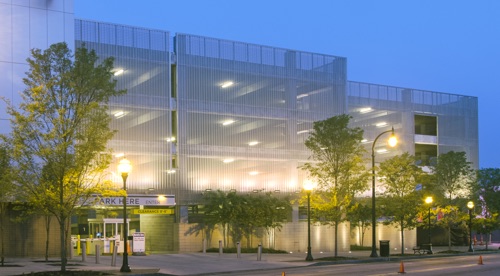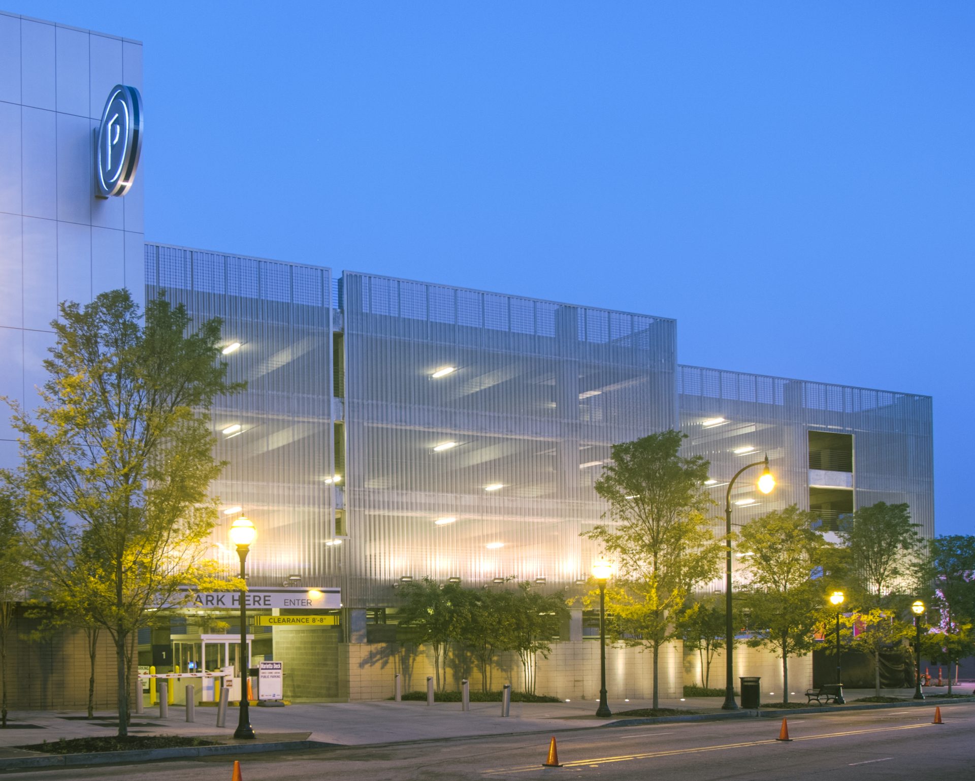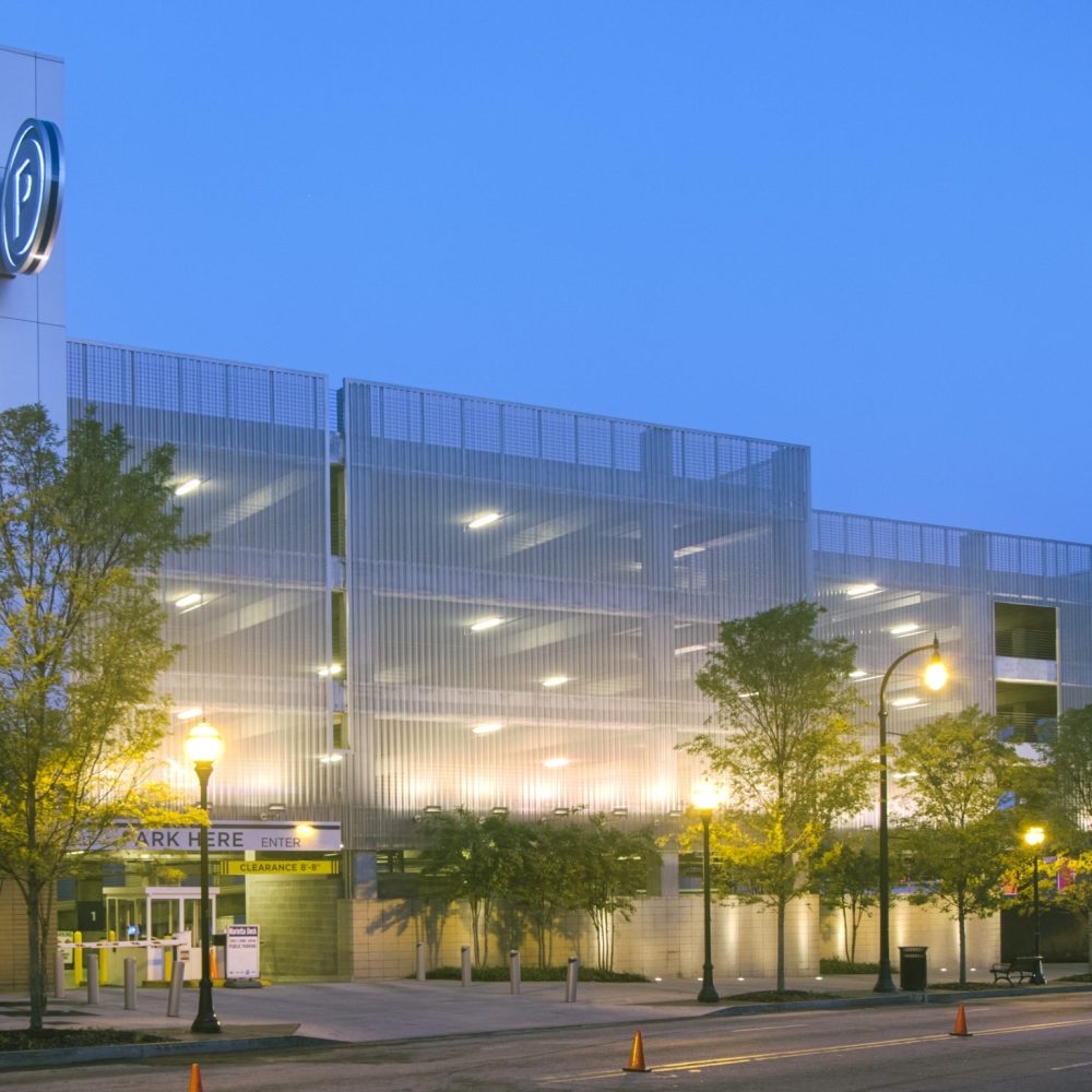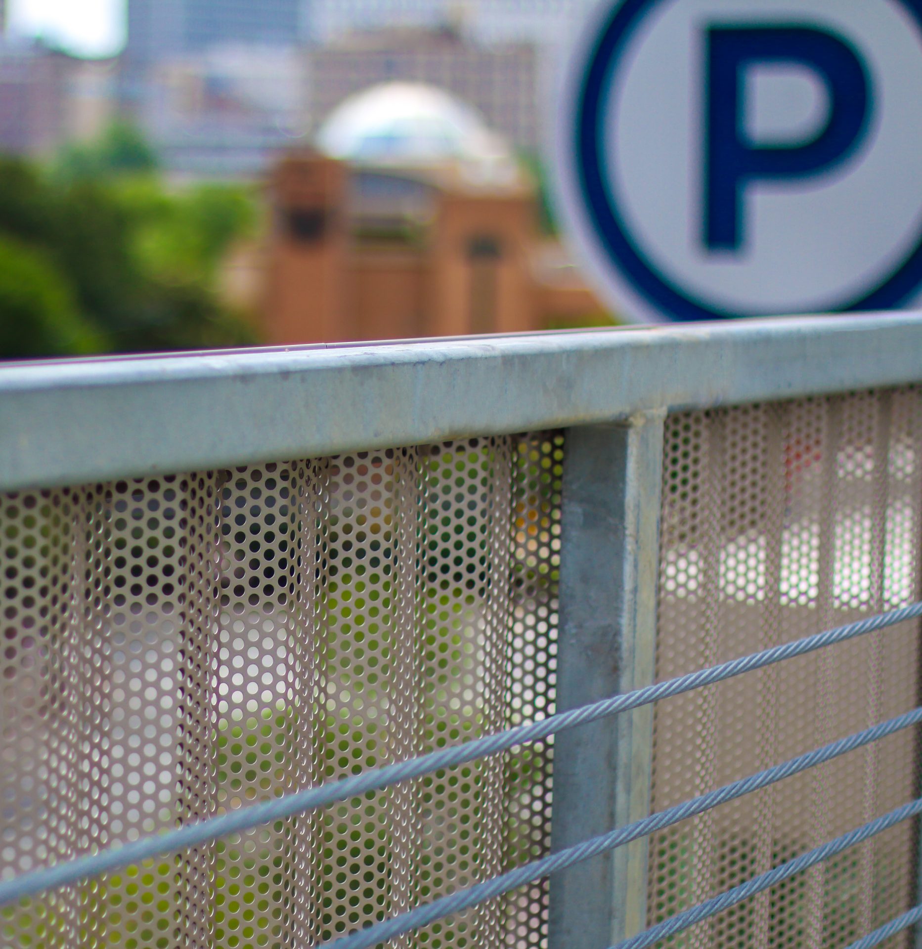 Parking garage screenwalls perform a variety of functions. In addition to transforming a bland structure into a welcoming facility, the screenwalls help signal parking boundaries to drivers. At night, the lit screenwalls provide an attractive backdrop in an area that can be dark and unwelcoming. Metal deck screenwalls help protect both vehicles and people from heights while securing the area from unwelcome visitors. Perforations admit airflow and natural light, and reflective structures feel less massive.