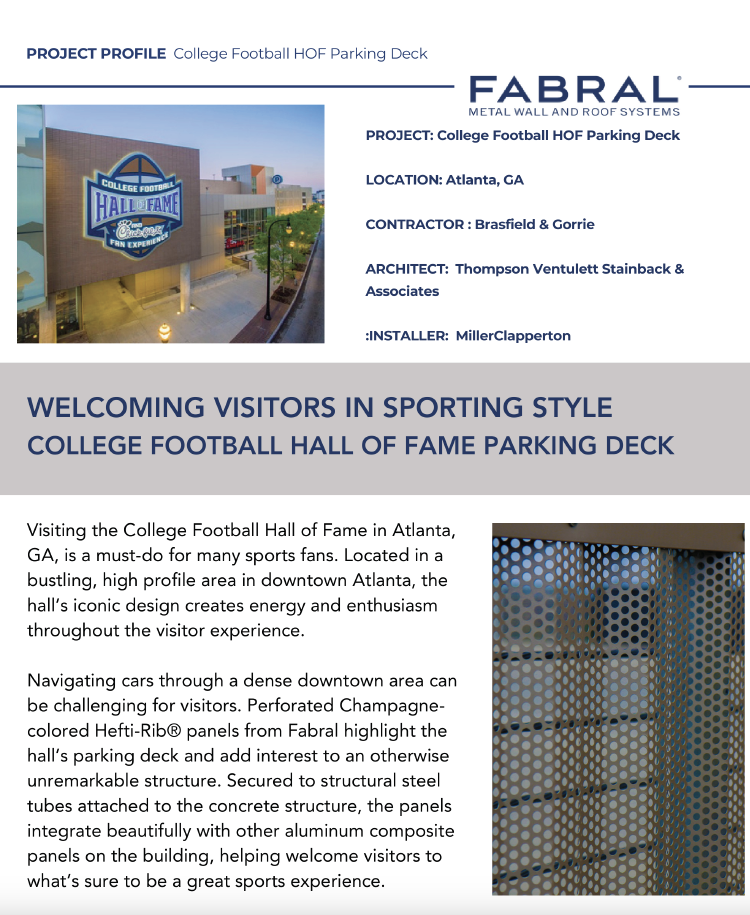 Navigating cars through a dense downtown area can be challenging for visitors. Perforated Champagne- colored Hefti-Rib® panels from Fabral highlight the hall’s parking deck and add interest to an otherwise unremarkable structure. Secured to structural steel tubes attached to the concrete structure, the panels integrate beautifully with other aluminum composite panels on the building, helping welcome visitors to what’s sure to be a great sports experience.