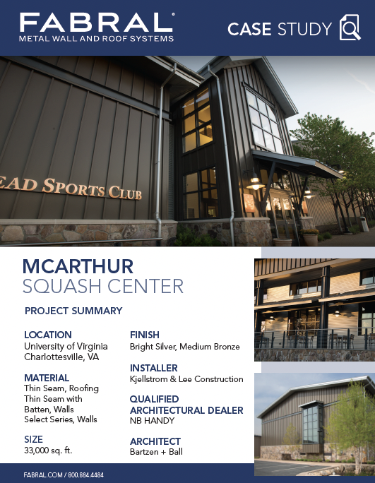 McArthur Squash Center at Boar’s Head Sports Club is the home of the Virginia men’s and women’s squash teams. After an extensive planning and review phase in 2011, the University formally announced a gift agreement with the Quantitative Foundation to fund the construction of a state-of-the-art squash facility for the UVa men’s and women’s teams. The 33,000-square-foot facility now provides a gateway for the sport’s development at the University and in the Southeast. The facility features 8 singles courts, 2 doubles courts, a four-wall-glass feature court, and capacity for 1,000 spectators. Fully clad in Fabral® metal from roofing to the wall panels, the McArthur Squash Center stands apart from the typical brick and slate architecture on campus. With an industrial metal tennis pavilion adjacent to the building, the architects of Bartzen and Ball in Richmond, VA chose metal to complement the existing facility while creating a more esthetically pleasing structure. The project features a total of 585 squares of Thin Seam® and HCF® panels in Bright Silver and Medium Bronze.The project was set in a different direction until Tom McGraw with WA Lynch Roofing Co pushed for the specs to feature Fabral metal. McGraw had developed a good working relationship with Fabral and convinced the young and progressive architecture firm, Bartzen and Ball, to choose them. Despite challenges caused by the size of the project and strict time constraints, the university was extremely pleased. “They fell in love with the building… it was an incredible end result” added McGraw.